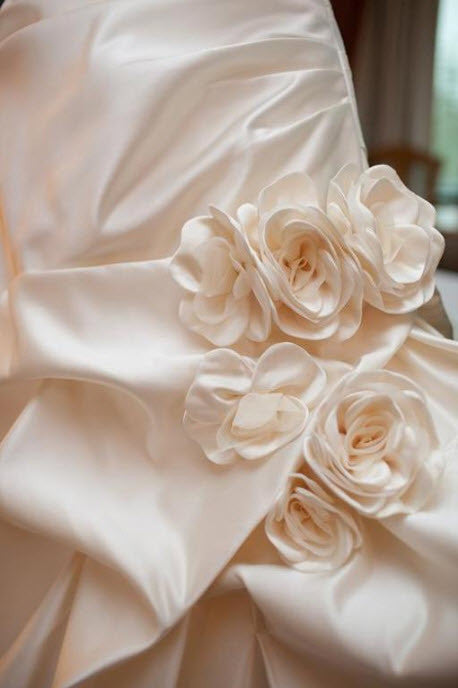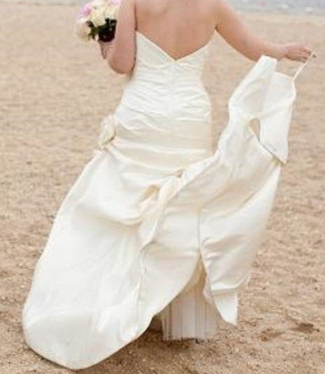 This cream pearl colored gown has a ruched bodice and a belt at the natural waist adorned with a flower. The dramatic skirt features pickups and additional flowers below the hip. This dress was never altered. It has a standard bustle in the back. It is once worn and in pristine condition. Bride was 6'0'' in heels, had a 32 waist and a 36C bust. Dress tag size is a 14 and street size is around a 10.